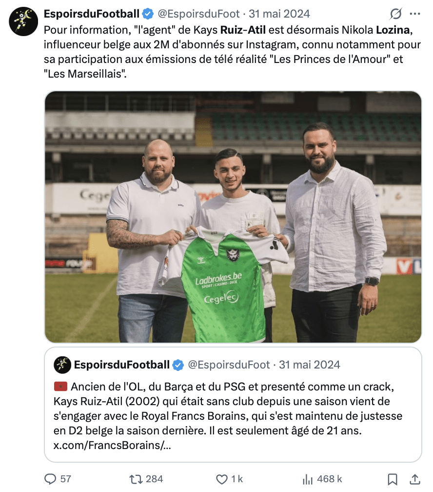 Autre enjeu de la communication, le « nouvel agent » de Kays Ruiz était Nikola Lozina, influenceur et homme de téléréalité. L’info allait être connue, il fallait simplement s’assurer que la photo qui allait circuler (principalement sur Twitter / X) soit positive pour le club. Photo ok. Sponsors maillots bien mis en évidence. Minimum 2M d’impressions via plusieurs comptes (près de 500 000 sur la capture d’écran ci-dessous).